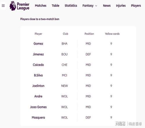 这就是球迷通常所说的“清零”节点,这个周末是第32轮,来到本赛季累积黄牌的第二个节点。英超官方公布,一共有8名球员,已经拿到9张黄牌,本轮再得到一张的话,就要自动停赛两场。其中垫底的狼队有3人,曼城和切尔西两大豪门,分别有B席和凯塞多两名中场。